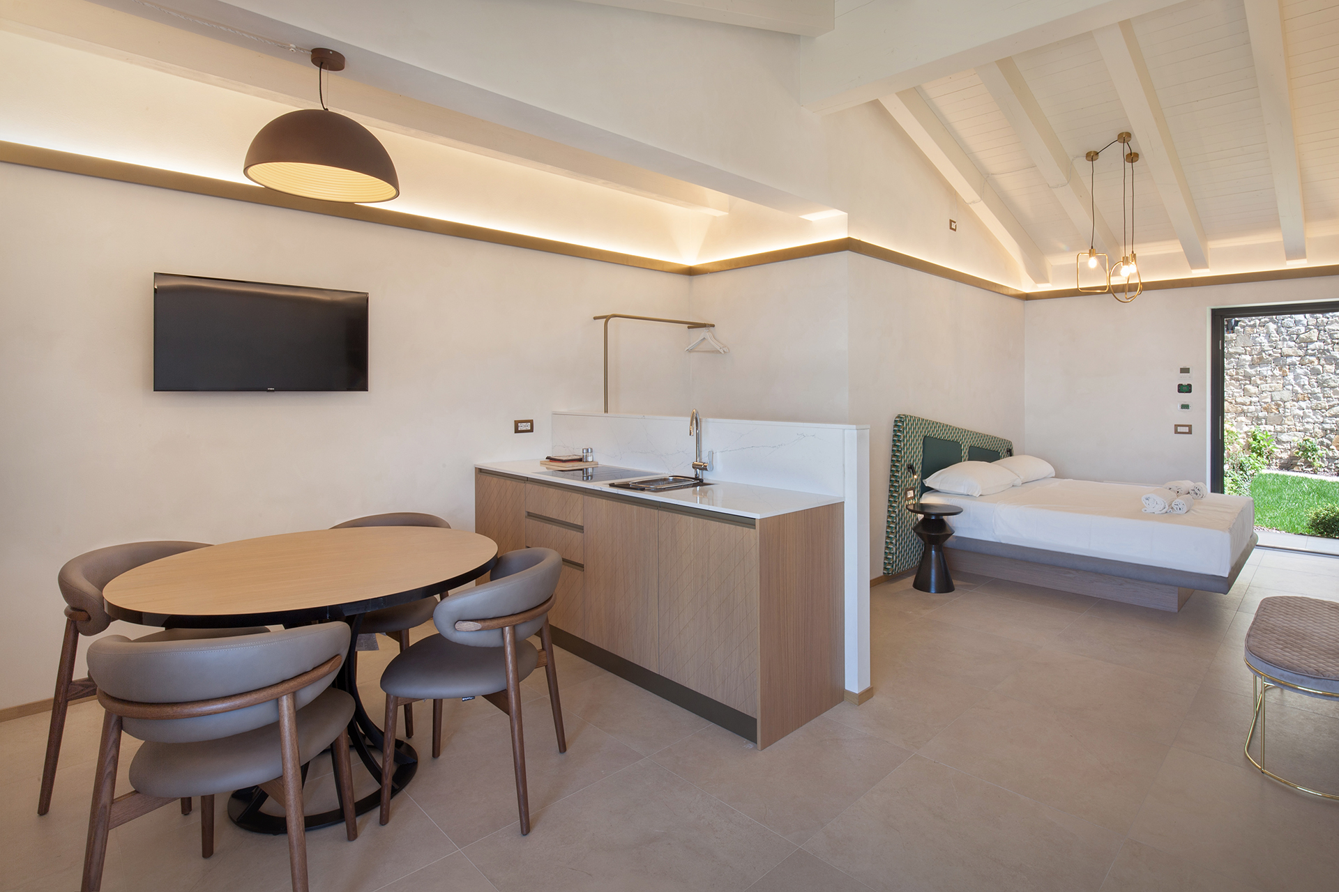 An elegant and refined studio apartment, designed for those who love open spaces but do not want to give up the fine details and features. The kitchen and the living area are equipped with all comforts, to make every moment an utterly relaxing experience. From the ARMONIA balcony you can experience unforgettable sunsets and enjoy all the beauty that Lake Garda has to offer.